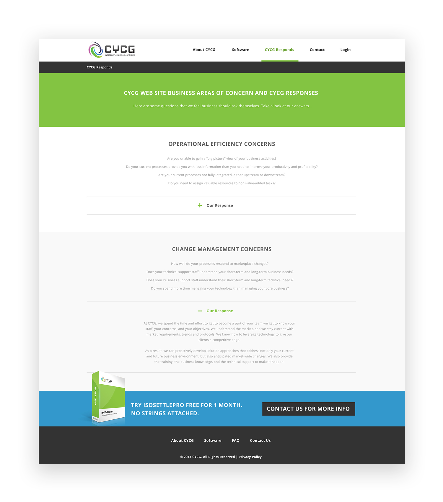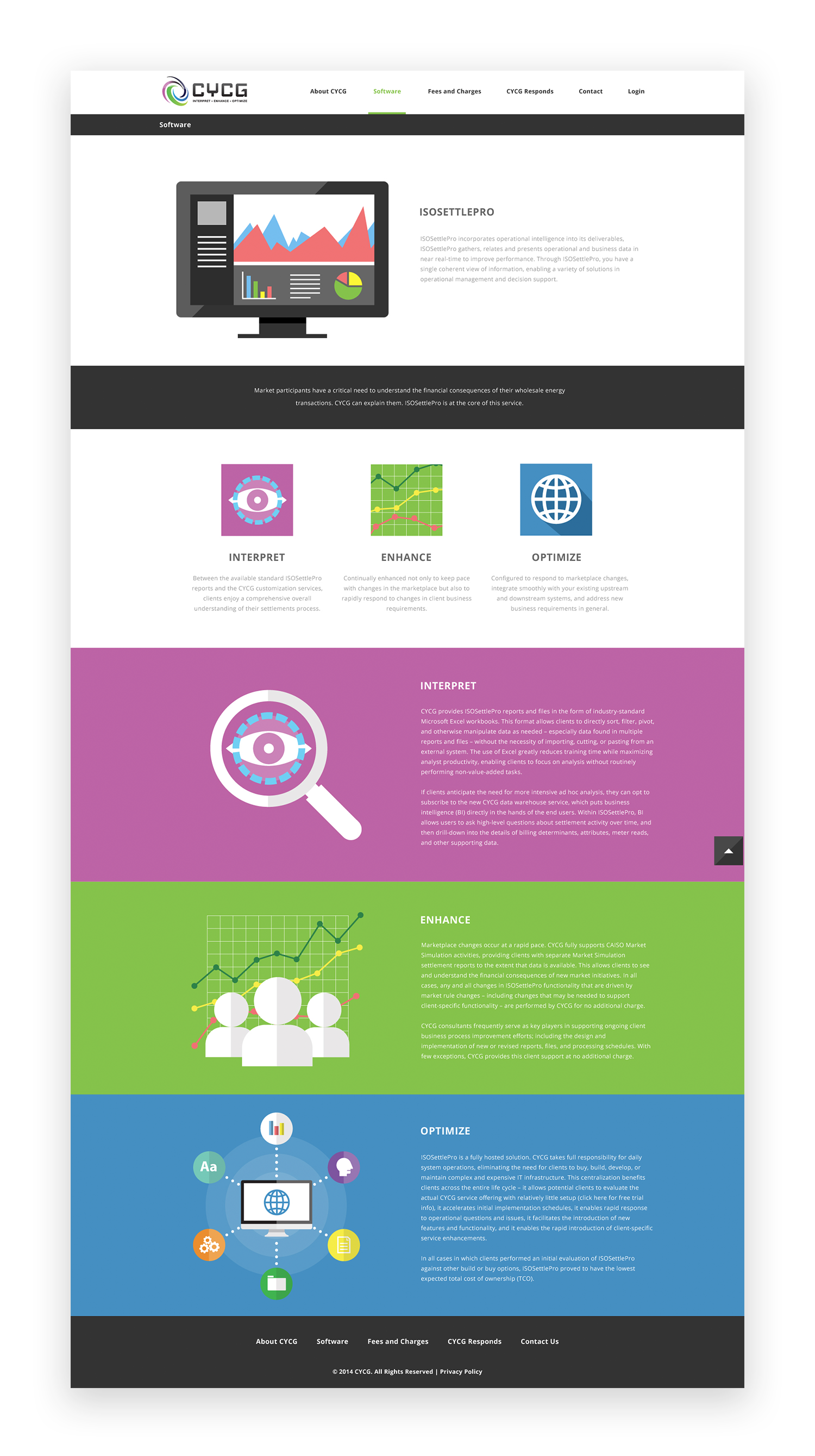 CYCG is a software company specializing in ISO software. The goal of the project was to create a clean and visually distinct user experience. This was accomplished by using bright colors along with bold graphics work as a companion to accentuate the content.